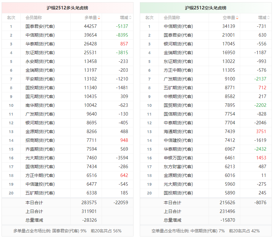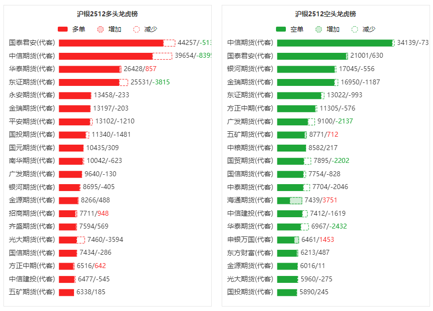 总体而言,沪银2512合约今日减仓上行,多空持仓排名前20席中,多空双方均呈退场态势,多头退场意愿强于空头。